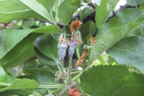 Bloom symptoms of fire blight 12 days after infection.