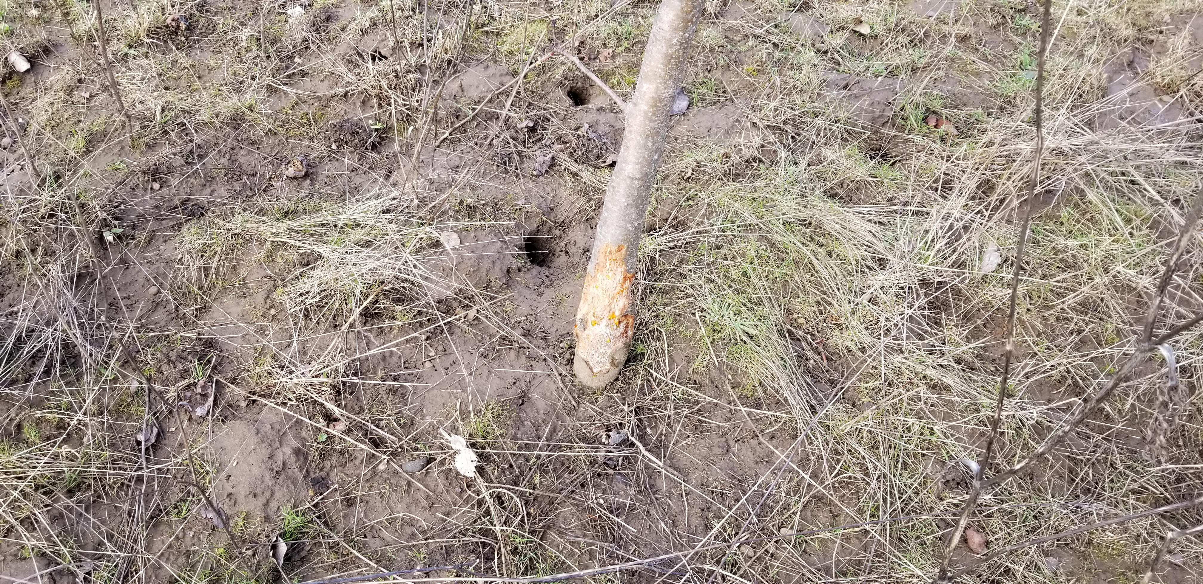 Rodent gnawing and girdling of tree trunk. Note vole holes in the ground.