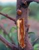 This shows brown rot of the blossom which results in a twig canker. Note the ooze droplet at the end of the brown cankered area, and sporulation on the blossom.