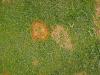 Yellow specks of rust on Perennial ryegrass leaf blades.