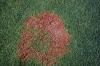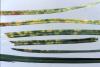 Note healthy leaf at bottom of image while the rest have rust on these perennial ryegrass leaves.