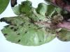 The first symptoms are small black spots on the leaves, which enlarge and form an ash-colored center.