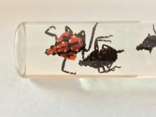 Description and damage When in flight, this brightly colored planthopper has wingspan of about 2 inches and is easy to spot due to the flashing red coloration on the hind wings. When at rest, these hind wings are hidden under light grey, spotted forewings. The newly emerged nymphs are black with white spots while the older nymphs develop a red body color with white and black spots. While the adults are mobile, we suspect that the greatest risk of the spread of this insect is due to the egg masses camouflaged to look like a smudge of mud found on various surfaces. At high densities, the adult female may lay the egg masses on just about any hard, smooth surface including vehicles, cargo crates, and much more. At high population densities, the spotted lanternfly reduces host plant vigor and productivity, but a primary problem is that this insect ejects large quantities of honeydew on surfaces beneath the infested plant including fruit and leaves. The honeydew feeds and promotes fungal growth that further stresses the host and discolors surfaces beneath the infested host including manmade surfaces like cars, decks, and the exterior of homes.