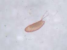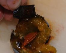 Extraction method: Place a layer of crushed fruit in a shallow white pan. Pour solution (salt or sugar) over crushed fruit. A good proportion of larvae will exit the fruit after a few minutes, looking for air at the top of the liquid. A majority will float to the surface, unless stuck in or under pulp. Wait for at least 15 minutes to get a majority of larvae out of infested fruit. Look for moving white larvae on the surface of the liquid. Eventually, however, they will die and sink to the bottom of the pan. The sugar solution will keep them alive longer than salt solution. Do not mistake SWD larvae for plant parts, fruitworm, thrips, aphid skins, other Drosophila larvae, etc.