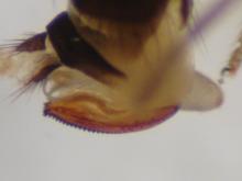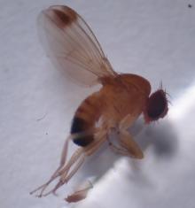 Identification SWD have red eyes and a yellowish-brown amber colored body measuring 0.125 inch (2-3 mm) in length. Two key characteristics distinguish SWD from other common fruit flies: 1) a black spot (sometimes dark, sometimes faded) near the leading top edge of adult male wings (females do not have wing spots); 2) the prominent saw-like ovipositor (used to insert eggs into fruit) on the female’s posterior end; and 3) the pupae of both sexes have two respiratory horns sticking out of the anterior end; each horn with a complete whorl of 6-8 fingers/points. Several dark, continuous bands are visible around the abdomen of both the male and female. A hand lens and good lighting are useful for seeing these characteristics. Note: if the female gets caught in a liquid bait (e.g., apple cider vinegar or yeast) within a monitoring trap, her ovipositor may extrude from the body (because of the liquid), thus aiding in the identification of female SWD. See references below.