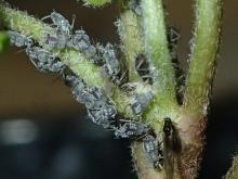 Aphids have many natural enemies, including lady beetles, syrphid fly larvae, green lacewings and parasitoid wasps. Check host plant closely for evidence of these predators and avoid broad-spectrum insecticide applications that would disrupt these natural enemy populations. Braconid wasps are especially important parasitoids. Look for large swollen, hardened, silvery-gray aphid "mummies" indicative of an aphid parasitized by a braconid larva. These wasp larvae pupate within the host and cut a semicircular "door" in the host's abdomen, through which the adult wasps exit the host. If the mummies are intact (without circular parasite exit holes), then cut the leaf pieces and move the mummies to areas where aphids are still a problem. The parasitoid wasp is a tiny black gnat-sized insect that upon emergence will begin searching leaves for fresh aphids to parasitize. An alternative is to control ants, which "farm" aphids to harvest honeydew and protect aphids from natural enemies.