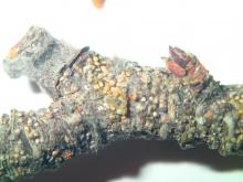 Pest monitoring Inspect twigs and tissues during the dormant season for scale insects. Pay attention to sickly plants and those with low vigor. The scale crawler stage is most susceptible to chemical control measures. Monitor the movement of newly hatched crawlers by wrapping a piece of sticky tape around an infested branch with the sticky side out. The crawlers are very small and best observed with a 10X magnifying glass. Check beneath scale for live females or eggs, or for predator mites or parasitoid wasp grubs. Fluff beneath scale could indicate parasitoid activity or that the eggs have hatched. Holes in a scale insect covering indicate that parasitoids have emerged.