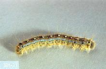 Pest description and damage The western tent caterpillar attacks a wide variety of plants including alder, ash, birch, cottonwood, and willow as well as fruit trees and roses. The over 1-inch-long adult moths are attracted to lights at night. Mature western tent caterpillars can reach a length of about 2.0 inches and are hairy, dull yellow brown, with rows of blue and orange spots on the body. Mature forest tent caterpillars can be as long as 2.5 inches and are black and blue with dorsal white "footprints." Eggs of these moths are laid on twigs or buildings and may be especially numerous around lights at night. The egg masses are brown to gray, about 0.625 inch in length, and look like bits of gray, hardened foam. Larvae of both species construct unsightly nests or "tents" in the crotches and branches of host trees. Larvae leave the tent by day to feed on foliage of host plants and may do significant damage by defoliation. Larvae usually return to the tent in the evening. Tent caterpillars can defoliate small trees. Defoliation can hinder plant growth and make the plants more susceptible to competition, diseases, or poor weather and defoliation over consecutive years may weaken or kill unthrifty hosts. Healthy trees usually will grow new leaves by midsummer.