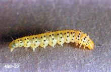 Pest description and damage Adult moths are reddish brown, with a wingspread less than 0.5 inch, and irregular light and dark bands on the wings. Mature larvae are 0.5 inch in length, yellowish to greenish, with black spots and a yellow-brown head. Pupae are yellow to brown with a white silken cocoon. The larvae skeletonize and roll leaves usually from the sides and tip. Damaged leaves are brown and papery and drop prematurely. Damage varies from inconsequential to serious, so monitoring is an important management tool.