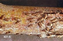 Pest description and damage Scale insects are small (less than 0.125 inch in length) soft insects that live beneath waxy scales. These insects are often identified by the shape and size of their scales, the description of adult males and females, immature crawler stage, color of eggs, and host plant preferences. The mature insect is approximately 0.125 inch long beneath a brown, or gray scale that is usually elongated and slightly curved like an oyster or mussel shell. Oystershell scales are found on trunks, branches, and twigs of many broad-leaved deciduous plants. They occur less frequently on the leaves and other plant parts. Scale infestations often are limited initially to isolated colonies on single branches or twigs. Newly emerged crawlers look like bright white pimples on the bark. Stressed trees where the scales encrust entire branches suffer the greatest damage.