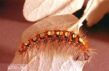 Pest description and crop damage Adult moth is satiny white. Larvae are approximately 2 inches long when grown, reddish brown, with white patches on top and tufts of hairs along sides. They can seriously defoliate trees such as cottonwood, poplar, and willow. They occasionally attack oak and aspen.