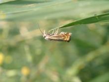 Pest description and crop damage The large sod webworm is a larvae of "lawn moths." The moths are characterized by wings that are partially folded around the body giving the moths a very slender appearance as well as a pronounced "snout." The large sod webworm is one of the larger webworms with a wingspan of 21 to 35 mm. The wings are usually white, grey or tan, and may have patterns of silver, gold, copper or other colored scale. Larvae can cause considerable damage to turf areas if conditions favor their development. However, due to the high natural mortality of small larvae, damage is seldom severe. The presence of larvae is indicated by dying back of grass shoots until irregular brown spots occur. Close examination usually shows leaf blades chewed off at base of plant.