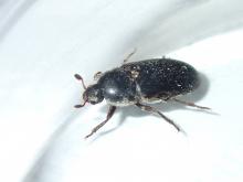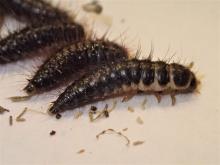 Pest description and damage These closely related beetles are about 0.125 inch in length, brown, and oval. They feed on a wide variety of stored products: cereals, seeds, spices, tobacco, dried fruits and nuts, dried skins, feathers, and preserved animal products.