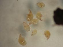 Pest description and damage Very small, light-colored mites often with very long body "hairs." They may infest stored foods and other organic material such as grain, flour, cereals, dried fruits and vegetables, mushrooms, meats, pet food, cheese, paper, tobacco, molds, bird and animal nests, etc. These mites are usually associated with moist or damp conditions. Piles of brownish "mite dust" may appear on open shelving, around the base of flour sacks, or on the surface of foods. These piles consist of dead and living mites, cast skins, and feces. Prolonged contact with mite infested foods may produce a mild dermatitis, and other contact may cause bronchial asthma and dust allergies. Also, if mites are taken internally with infested food, stomach disorders can result.