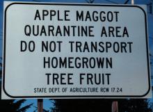 The apple maggot is a small fly native to the northeastern United States and Canada, where it originally fed on hawthorn. It was not until 100 years after apples were introduced to North America that it was found feeding on apples. Today, it is a key pest of apples in northeastern regions, where several insecticide sprays are necessary to produce fruit free from maggot injury and contamination. It has since migrated to the PNW, where it was originally found in Portland in 1979. By 2000, it was found in most western Oregon and Washington counties, where it is a very destructive pest. The apple maggot remains a threat to the commercial Northwest apple industry in the Columbia River Basin. The maggots develop in apples, quince, and the fruits of native and ornamental hawthorn. The apple maggot also may occur incidentally in pear, plum, and tart cherry. Early cultivars of apples are particularly susceptible to damage. There is a quarantine on the movement of fruit from Washington and Oregon counties known to have this pest. Check with your State Department of Agriculture for details.