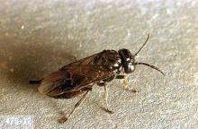 Pest description and crop damage Pear sawfly is a European insect now found in most areas of the U.S. It attacks both pear and cherry, and also is found on mountain ash, hawthorn, and ornamental Prunus spp. The adult is a glossy black wasp about 0.2 inch in length. The larva initially resembles a small slug, due to the olive-green slime that covers the body and the fact that the head is wider than the rest of the body. Mature larvae are 0.37 inch in length and orange-yellow. Larvae feed on the upper surface of leaves, skeletonizing them, the fruit surface may also be scarred when populations are very high. Heavy feeding causes leaf drop with reduction in vigor, yield and return bloom, particularly on young trees.