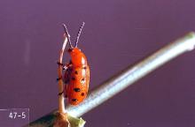 Pest description and crop damage Adults are brick-red with six black spots on each wing cover. Eggs are green and deposited singly. Larvae are cream color with a light brown head. They most frequently are found inside the berry on female plants. Pupae are light yellow in a silken cocoon. Because larvae feed on the berries, infestations of the spotted asparagus beetle are less damaging than the asparagus beetle for fresh market and processing asparagus. However, the spotted asparagus beetle can be a major pest in seed production fields.