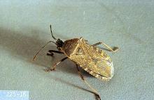 Pest description and crop damage The squash bug attacks squash, pumpkin, melons, and related crops. Adults are typically dark brown, but may have gray or light brown markings. They are about 0.75 inch long at maturity. Squash bug nymphs and adults feed on the leaves, causing small yellow specks which later turn brown. Squash bugs also inject a toxin into vines, which causes a wilt from the point of attack to the end of the vine. Affected runners wilt and turn black and crisp. Small plants may be killed, while larger plants may lose several runners. Squash bugs also may attack young fruit.