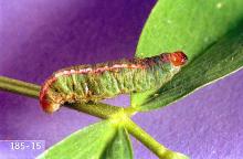 Pest description and crop damage This is the largest weevil found in legume fields. Fully developed larvae are about 0.5 inch long, green to yellow, and have a brown head and a white or pink line down the center of the back. Larvae feed on buds and leaves. Larvae rarely need chemical control in alfalfa.
