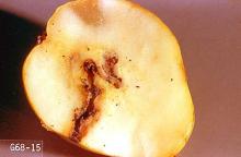 Pest description and crop damage The codling moth is the most serious direct pest of apples in commercial and home orchards in the PNW. Wild populations are rampant in many areas of the PNW, and most apple varieties are heavily damaged without protection. Larvae bore into the fruit, often through the calyx or areas of contact between adjacent fruit. Larvae feed toward the core, leaving a characteristic tunnel filled with frass that often leads to fruit rotting. Larvae that die in the process of penetrating fruit can leave stings, which are shallow wounds in the fruit skin. In most regions of the PNW there are two damage periods; first the young fruitlets are attacked, and later the mature fruit.