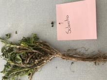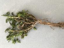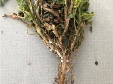 Cause Sclerotinia trifoliorum or S. sclerotiorum, which are soilborne fungi that can survive indefinitely as sclerotia in soil. They can attack stems and crowns in wet, cool springs. Damage is most severe on stems in solidly planted mature alfalfa fields. Early-growing varieties such as DuPuits are particularly susceptible. In the Pacific Northwest, sclerotia germinate in spring, producing small (0.25 to 0.5 inch in diameter), light brown, stalked discs (apothecia). Spores are produced and can be carried long distances by wind.