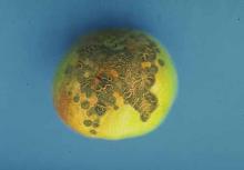 Late-season infections may not show on fruit until they are in storage where rough, black, circular lesions develop. The lesions, usually varying in size up to 0.25 inch in diameter, are sometimes referred to as pinpoint scab or storage scab.