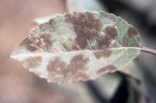 Symptoms The first visible symptoms on leaves in spring are pale, chlorotic, water-soaked spots the size of a pinhead. These enlarge, becoming darker and smoky in appearance, later taking on an olive shade and ultimately a brownish black color. Spots may be any shape but are frequently circular. Young infections often show a radiating spread of fungal tissue just under the surface of the leaf, and such areas later appear as irregular, brown-colored infections. Spots can only be found on one side of the leaf (top or bottom) during the growing season. Diseased leaves can be curled and distorted and often drop early, thus defoliating and weakening the tree.