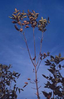 Symptoms Ash rarely produces the wilting and vascular discoloration common to other hosts such as maple. Foliage turns light green and chlorotic followed by a leaf scorch and premature defoliation. Older leaves seem to defoliate first, according to observations from local nurseries. Upper branches die back in a random or one-sided distribution on the tree. Branches tend to die back in summer after the first heat stress of the year. Trees infected in the nursery often develop symptoms within 1 to 3 years after planting but can remain symptomless for longer periods. Symptom expression will vary in intensity from year to year.