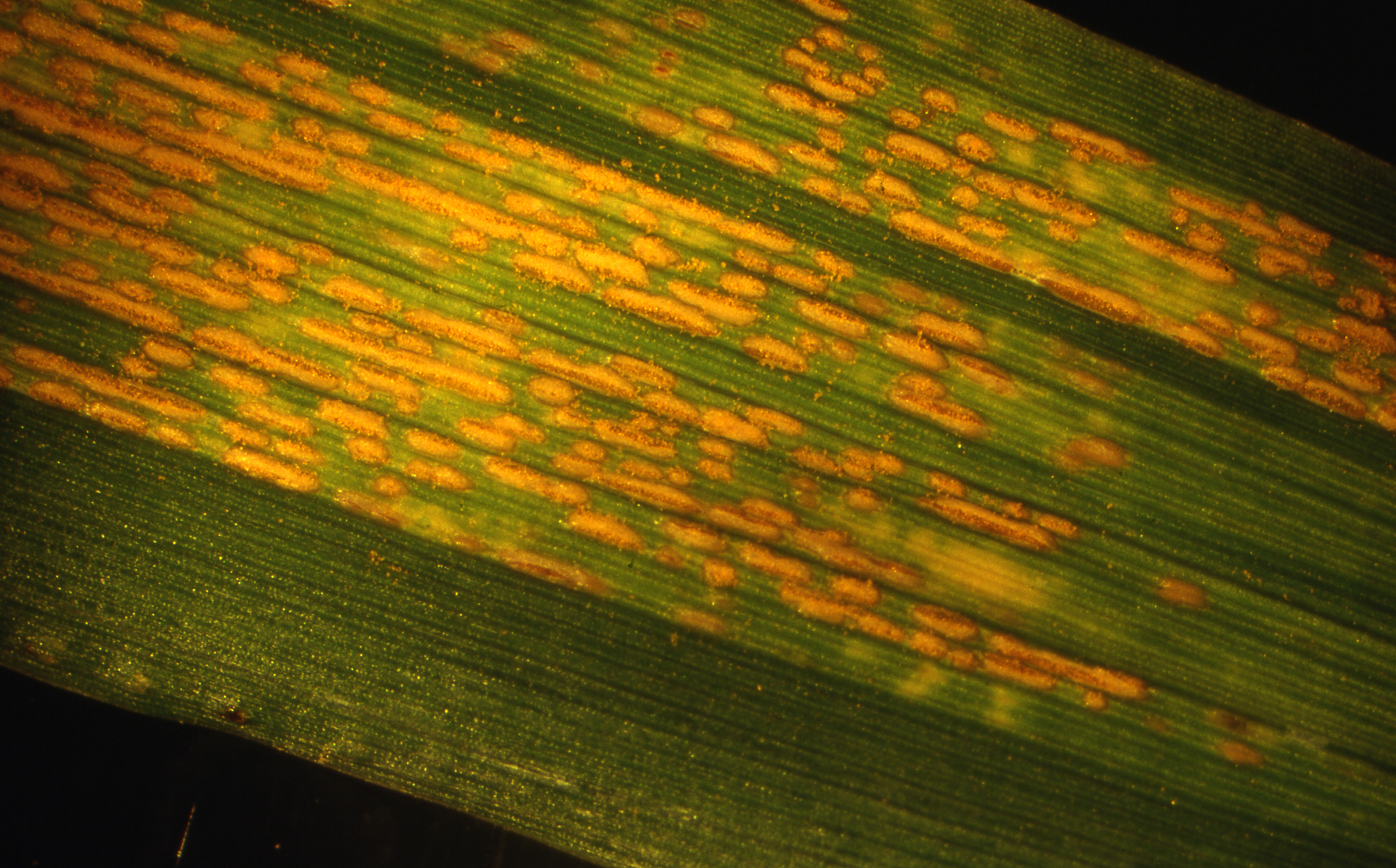 Symptoms Linear, orange-yellow pustules appear on leaves and/or heads at any growth state after infection. Pustules coalesce to form long stripes between leaf veins. In advanced stages, entire leaf blades of susceptible varieties may be covered with pustules. The black spore stage develops as linear black pustules covered by the leaf epidermis.