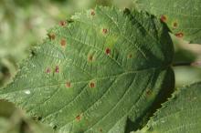 The fungus overwinters as telia principally on leaves that remain attached to canes and/or those trapped in cane bundles. Teliospores germinate in the spring and produce basidiospores that can infect leaves of primocanes and floricanes. These primary infections produce aecia, which produce aeciospores, which also infect leaves. These infections produce uredinia, which produce urediniospores that infect the flower buds and leaves and stems of the primocanes and floricanes. New uredinia are produced from these infections and continue the epidemic, building up disease in rapid, successive cycles. Black pustules (telia) develop among the uredinia in the late summer/early fall on infected leaves. Old floral canes can be a significant source of spores for fall infection of primocanes in the Pacific Northwest. Wet conditions (> 6 hours of leaf wetness) with mean daily temperatures between 49°F and 64°F favor disease development. Spores are easily spread by the wind; young leaves at three-quarters expansion are most susceptible to infection.