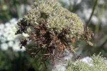 Symptoms Leaf symptoms start as small, irregular, yellow areas, which later turn to irregular, water-soaked, brown lesions. The lesion is surrounded by an irregular yellow halo, and the center becomes dry and brittle. Linear, dark brown lesions on petioles and stems may appear, sometimes with gummy bacterial exudate. Umbels may be partially or completely blighted. Seed yield and quality may be adversely affected.