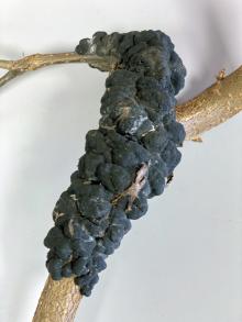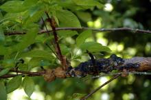 Symptoms Elongate, corky outgrowths or "knots" occur on shoots, spurs and branches of Prunus spp. Knots tend to be longer than they are wide. Newly formed knots have greenish, soft tissue while older knots are black and may be colonized by other fungi or insects. Knots can continue to expand 1 inch or more each year. Limbs are stunted and killed when girdled by the fungal growth. Older knots and growths take on a witches' broom appearance. Known by various names such as "crap on a stick" due to its resemblance to dog poop.