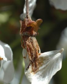 Symptoms Infected flower parts turn light brown and may develop areas of buff-color (M. fructicola) or gray (M. laxa) spores. Infected petals may look water soaked, which can be mistaken for frost injury. Flowers generally collapse as the fungus invades through the pedicel. Infected flowers often adhere to twigs and spurs through harvest or even winter.