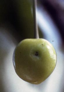 Fruit symptoms begin as small, dark spots that enlarge rapidly. Fruit remains fairly firm and dry relative to a watery rot caused by Rhizopus sp. Production of masses of buff-color spores is equally rapid in the necrotic area. Peaches may have concentric rings of gray sporulation (in response to light) as the rot takes a few days to encompass the entire fruit. These fungi often colonize rain-cracked cherries. Occasionally, green fruit pitting has been attributed to this fungus as it can be detected in small necrotic area at the bottom of the depression in the skin.