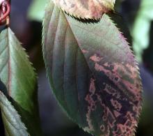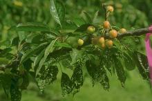 Symptoms generally consist of chlorosis, necrosis, leaf deformity, and stunting. Entire plants may be affected, or only a portion may show symptoms. Normal PNRSV symptoms consist of a few rings or chlorotic areas that may develop into severe necrotic spotting and a shothole appearance. Careful inspection of sweet cherry trees in late spring may reveal scattered older leaves or entire spurs with necrotic spotting or etched rings. Sometimes one branch will show tattered leaves or symptoms of the rugose mosaic strain. Yield on trees infected with the normal strain is reduced about 5%.