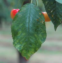 The cherry rugose mosaic strain produces "boating" and turned-up leaf tips, delayed fruit maturity (up to 3 weeks), and enations (ridges of rasp-like growth) on undersides of leaves. Leaves with enations are often thicker and stiffer than normal leaves. Severe monetary loss occurs from delayed maturity of the fresh market cultivars such as Bing and Lambert. Smaller losses occur from the delayed maturity of fruits for the brine trade. Trees infected with the rugose mosaic strain set a very light crop that matures late.