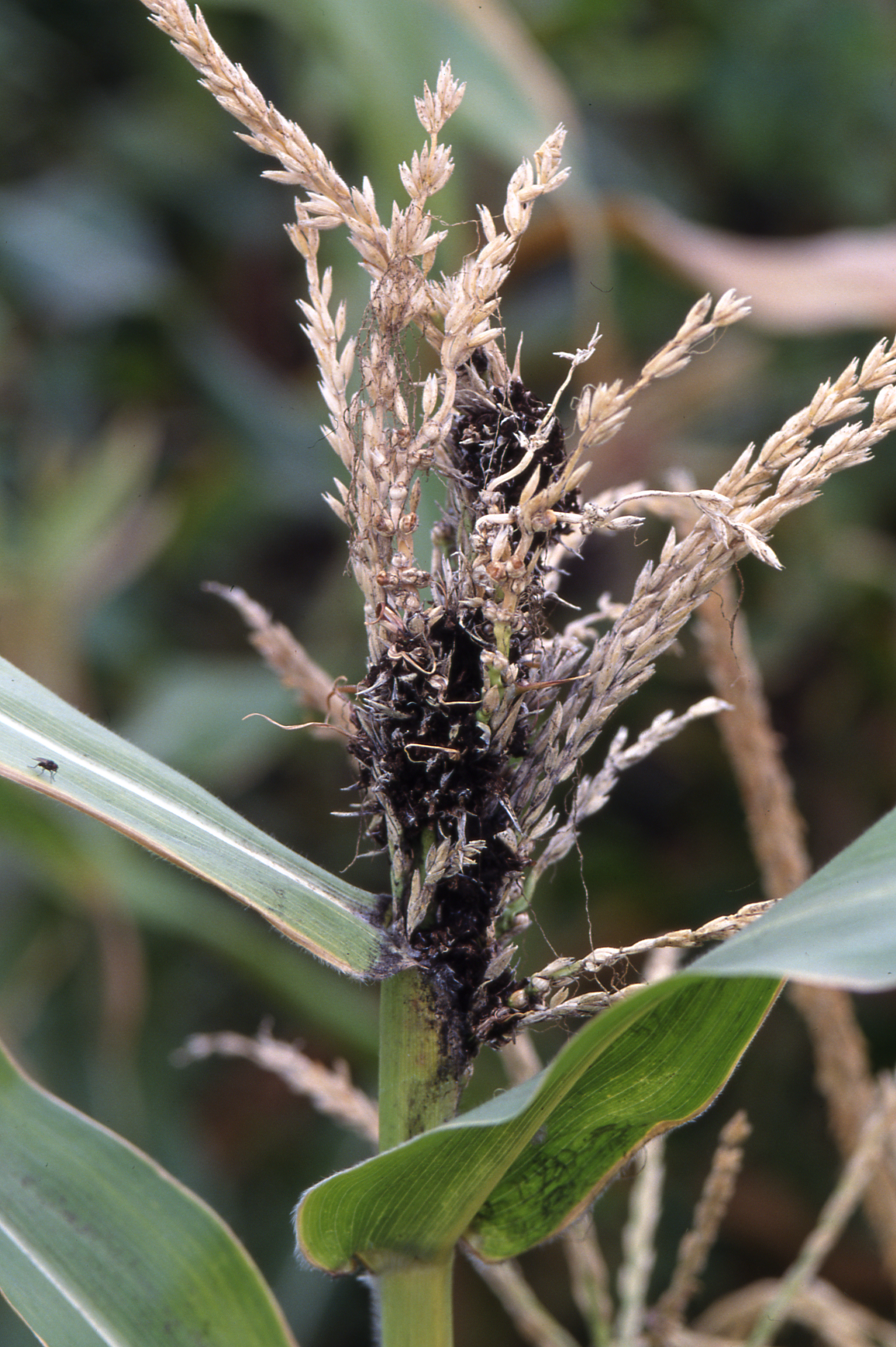 Cause Sporisorium reilianum (syns. = Sorosporium reilianum, Sphacelotheca reiliana, Ustilago reiliana), a fungus that survives as spores in soil, remaining viable at least 5 to 7 years. Spores may be wind-blown long distances. In the Willamette Valley of Oregon, corn pickers are the most likely method of spread. In the Pacific Northwest, the fungus has been observed only on corn. However, there are two strains of the fungus. One fungus attacks only corn, the other only sorghum and sudangrass. Infection reportedly occurs in the seedling stage; however, greenhouse studies demonstrate infection can occur several weeks after the corn has been planted. After infection, the fungus develops systemically. Infection may occur at soil temperatures as low as 59°F but occurs more readily at 68°F to 86°F. The fungus is not internally seedborne but can be carried on the seed surface.