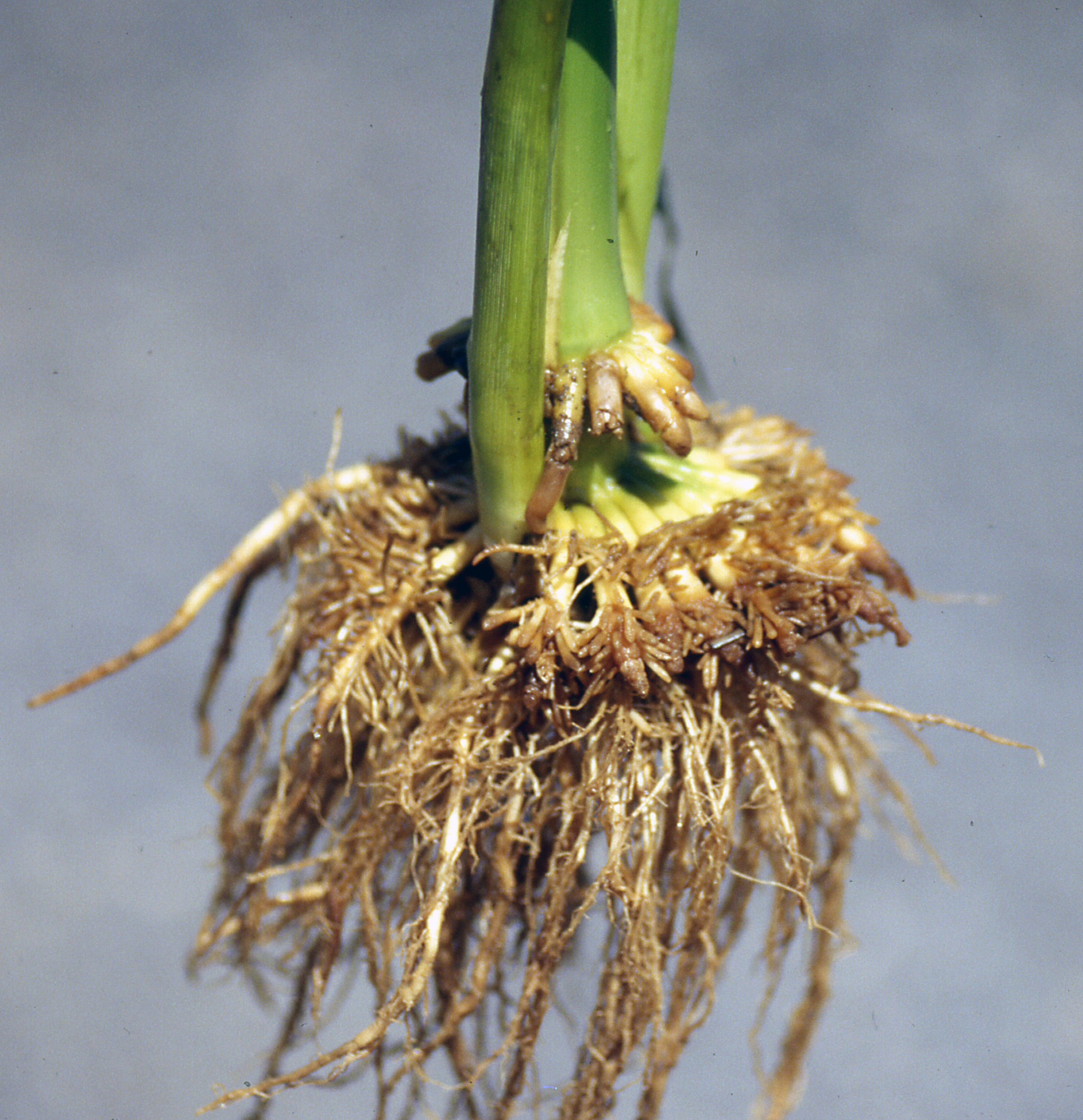 Symptoms Root rot may develop as early as the 6-leaf stage on the primary or seminal roots and is noted by the present of rot or brownish lesions on the roots. Root rot may continue to develop and can be severe on the adventitious root portion, including rooted brace roots. Severe root rot may be apparent early season, at silking, or later.