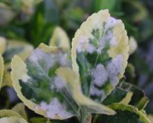 Cause Erysiphe euonymicola (formerly Oidium euonymi-japonici), a fungus that occurs only on Euonymus japonica and is found wherever the host grows. The green cultivar Patens is very susceptible. In the past, the fungus was rarely observed on variegated cultivars but now is much more common. The fungus overwinters as mycelia and spores on infected leaves and stems. Airborne spores are spread to newly emerging leaves in the spring. Infection is favored by temperatures of 70°F to 80°F and relative humidity between 85% and 100%. Free water on leaf surfaces will often suppress spore germination.