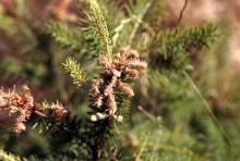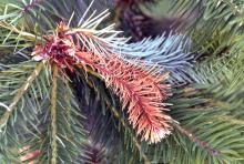 Cause Botrytis cinerea, a fungus that can be involved in damping-off of young seedlings, a seedling blight in the greenhouse, field or cold storage, and even a shoot blight of older trees in nurseries or Christmas tree plantations. Current-season shoots of conifers may be infected. Cool temperature and moist conditions favor disease development. Close tree spacing coupled with dense foliage and poor air circulation in Christmas tree plantings provide an excellent condition for gray mold blight. The fungus overwinters as sclerotia on infected twigs and needles. More of a problem in greenhouse container nurseries than in bareroot nurseries.