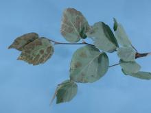 Cause An unknown leaf spot is common in landscapes and gardens in western Oregon. The main symptom is a brown necrosis of the underside of the leaf that looks like a network of lines on the margins of the leaf spot. Spots may be numerous and generally occur between the leaf veins. Tops of leaves may show no symptoms at all or more subtle necrosis between the veins. Symptoms were not apparent when surveying in early June 2022 but by July spots were quite numerous on plants throughout OSU campus. No biotic causes have been found and although ozone injury is suspected it does not account for all observations.