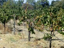 Symptoms of Pierce's Disease first appear as water stress in midsummer. Leaves become slightly yellow or red along margins in white and red varieties, respectively, and eventually leaf margins dry or die in concentric zones. Fruit clusters shrivel or raisin. Dried leaves fall, leaving the petiole attached to the cane. Wood on new canes matures irregularly, producing patches of green, surrounded by mature brown bark. 'Pinot Noir' and 'Cabernet Sauvignon' have highly regular zones of progressive marginal discoloration and drying on leaf blades.