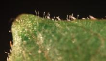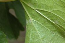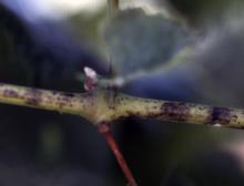 Flag shoots are difficult to detect. Some young shoots may be covered with a large white mass of mycelium. Others may have only a hint of thin threads on the shoot. Shoots generally are delayed in bud break and appear stunted and somewhat yellowed compared to healthy shoots. Can be confused with normal trichome density of young shoots of some cultivars.