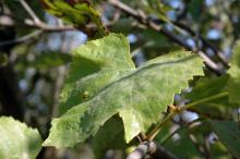 Chasmothecia on the exfoliating bark release sexual spores during rainy weather above 50°F from budbreak through bloom. This weather also favors infection that results in individual powdery spots, called colonies, on the surface of leaves growing close to the bark.