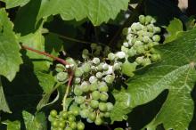 Grape berries are highly susceptible from the time calyptras (hoods) fall off (BBCH 60) to shortly after bloom when berries are about pea size (BBCH 73 to 75). Susceptibility of the fruit drops rapidly after that time. Grapes do not get new infections on fruit after 8% Brix but can still have sporulation up to 15% Brix. Leaves and canes, however, can be infected up to and past harvest.