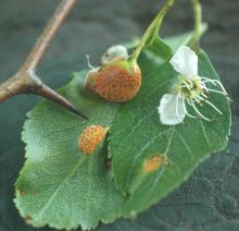Cause Several fungi in the genus Gymnosporangium cause rusts on hawthorn. G. clavariiforme (alternate host juniper) and G. libocedri (alternate host incense-cedar) have been reported from Oregon; from Washington, G. clavipes (alternate host cedar and juniper); and for all states including Idaho, G. bethelii (alternate host juniper) . The rusts are throughout North America wherever perennial hosts (mainly juniper) grow near the deciduous hosts (members of the rose family, including hawthorn, Amelanchier, cotoneaster, apple, pear, quince, and Sorbus). Spores that form on hawthorn are usually shed in mid- to late summer and infect juniper. Juniper galls release orange spores in spring, which are blown to nearby hawthorns and other hosts. These spores infect newly opening leaves and tender young fruit. Spore stages produced on the junipers or cedars infect only hawthorn and members of the rose family in early spring but can be produced repeatedly over 2 to 3 years from one infection.