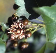 Symptoms Leaves, fruit, and sometimes twigs are infected, causing conspicuous leaf spots (bright yellows to oranges) and defoliation as well as fruit and twig deformities. When infections on hawthorn mature, hair-like (tubular) spore-bearing structures (aecia) extrude from the tissue. Juniper infections usually appear as swellings or galls on twigs and produce orange spores in spring.