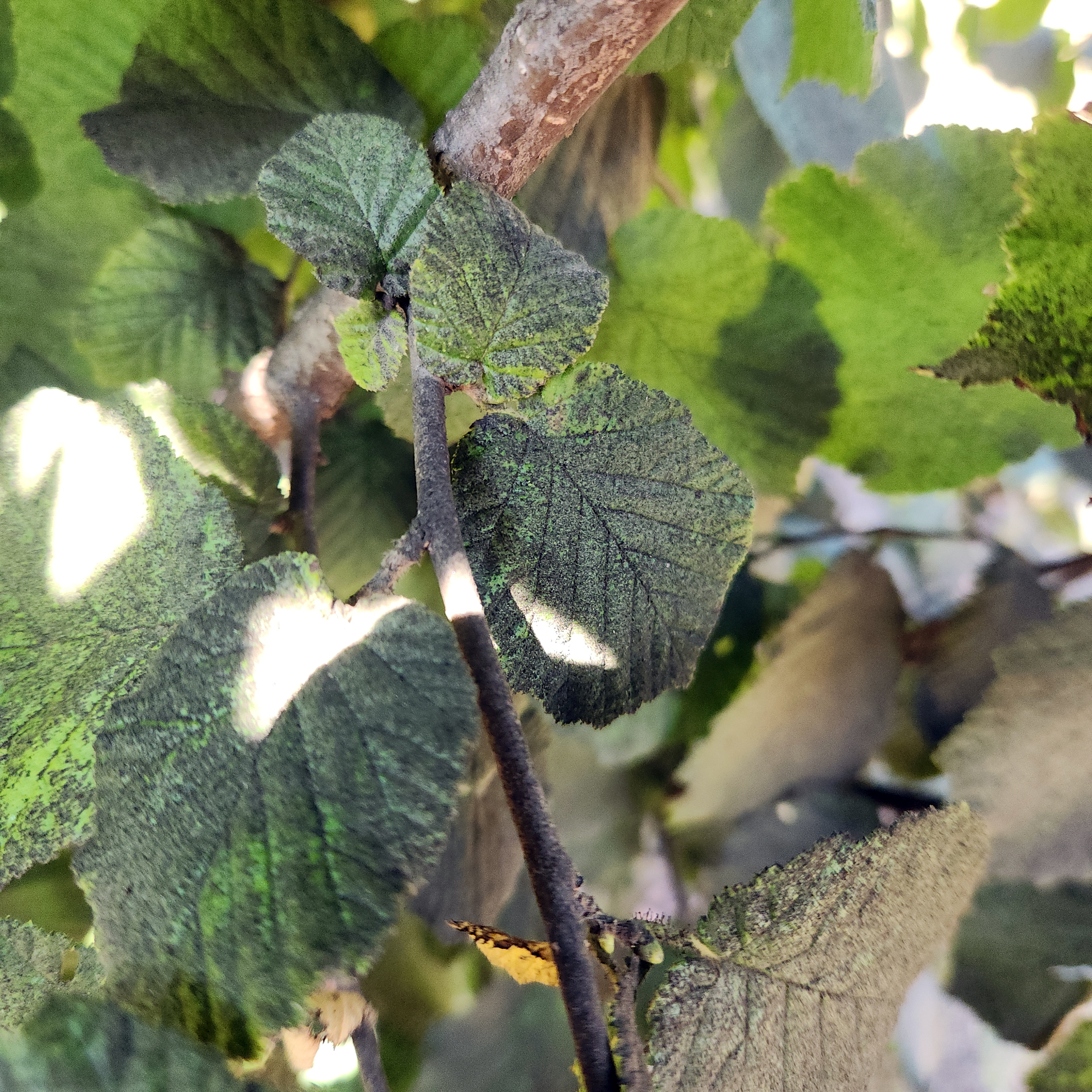 Stem of 'Lewis' hazelnut with back sooty mold.