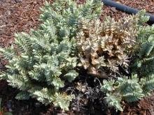 Plants with charcoal rot have one or two stems per plant with leaves that begin to turn yellow and wilt. As the symptoms progress, the tips of the branches droop and eventually the entire branch dies, turning brown and brittle. On larger plants, the disease may progress slowly, sporadically taking out a branch or two over several years. On smaller, younger plants (less than 3 years old), however, the disease can be quite rapid where the entire plant appears to dry up and die within a few weeks. Symptoms are occasionally noticeable as early as February, but are more commonly observed once the weather warms up later in spring and summer. Root and stem tissues near the root collar may become discolored internally, turning orange or brown with prominent gray or black streaking. The root exterior may also turn black as microsclerotia are produced both internally and on the roots surface. It's this black color on the infected tissues that gives rise to the common name for the disease, charcoal rot.