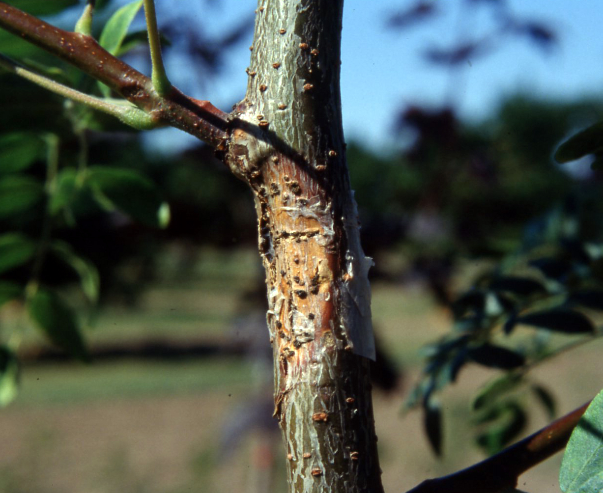Fusarium canker-The earliest symptom is a subtle, orangish bark discoloration that is more sunken as the season progresses. Later, a definite, elongate, sunken, discolored canker is evident. Branches or trunks may be girdled, causing wilting, yellowing, and dieback above the canker. After the bark dies, fungal fruiting bodies (sporodochia) break through the lenticels. These sporodochia are football-shape (elliptical) and are yellow, orange, or salmon.